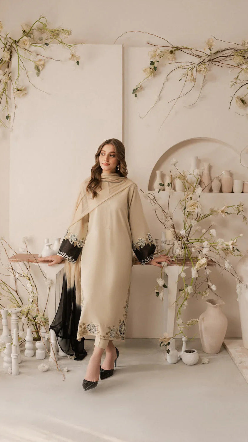 For the woman who knows her mind and is her own guiding light, a majestic kurta set in rich hues of beige and black. Featuring floral embroidered motifs, elevated with organza insertions in the sleeves and daaman, the Ghazal set is handcrafted for pure elegance. Each karigar spends a full-day in creating this intricate work of art and turn it into a masterpiece.