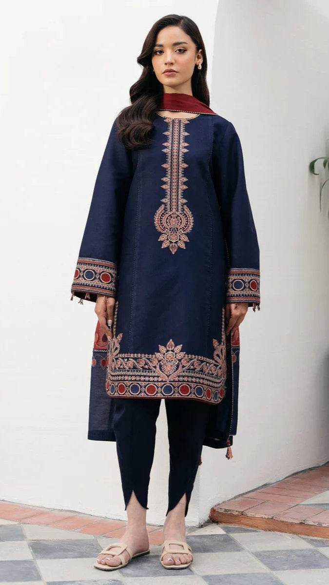 This elegant three-piece stitched lawn dress features intricate embroidery on the front and sleeves, showcasing fine craftsmanship. The fabric provides a soft, comfortable feel, perfect for both casual and formal wear. The outfit includes a plain back and a matching trouser, offering a balanced and cohesive look. Completing the ensemble is a luxurious digitally printed lawn Dupatta , adding a touch of warmth and sophistication. With its delicate detailing and premium materials, this outfit is a stylish choice for any occasion, blending traditional elements with contemporary fashion.