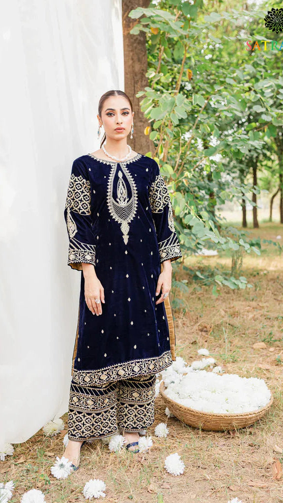 This elegant stitched 3-piece velvet embroidered dress is designed to add a regal touch to your wardrobe. The shirt features a fully heavy embroidered front with intricate detailing that enhances its luxurious appeal. The front and sleeves are fully adorned with intricate embroidery, showcasing fine craftsmanship and timeless charm. Paired with a richly embroidered organza dupatta, this outfit brings sophistication to every occasion. Designed to perfection, it reflects a graceful blend of tradition and modern style. Ideal for formal gatherings, parties, or festive wear, this dress ensures you stand out beautifully with its regal appeal.