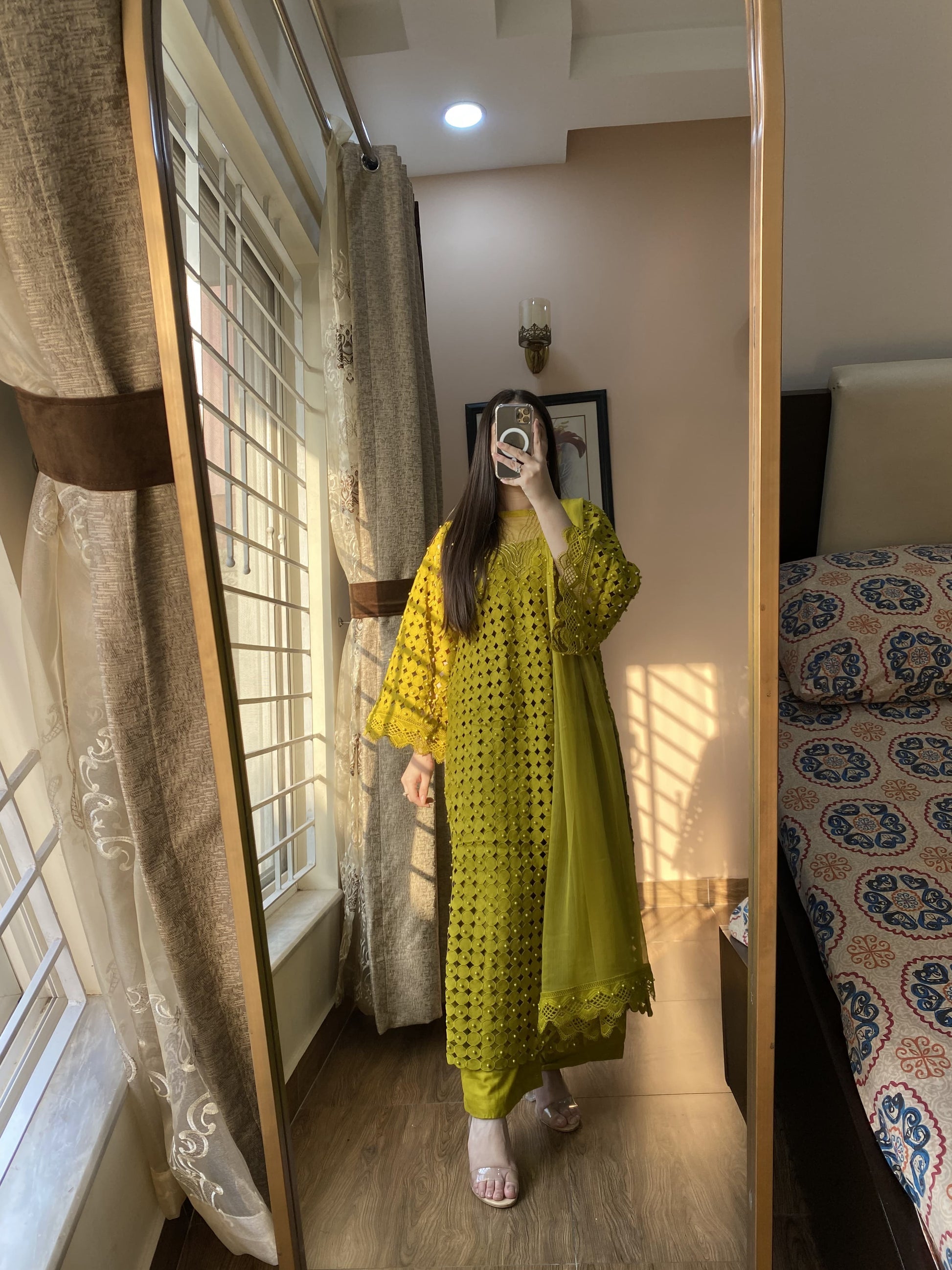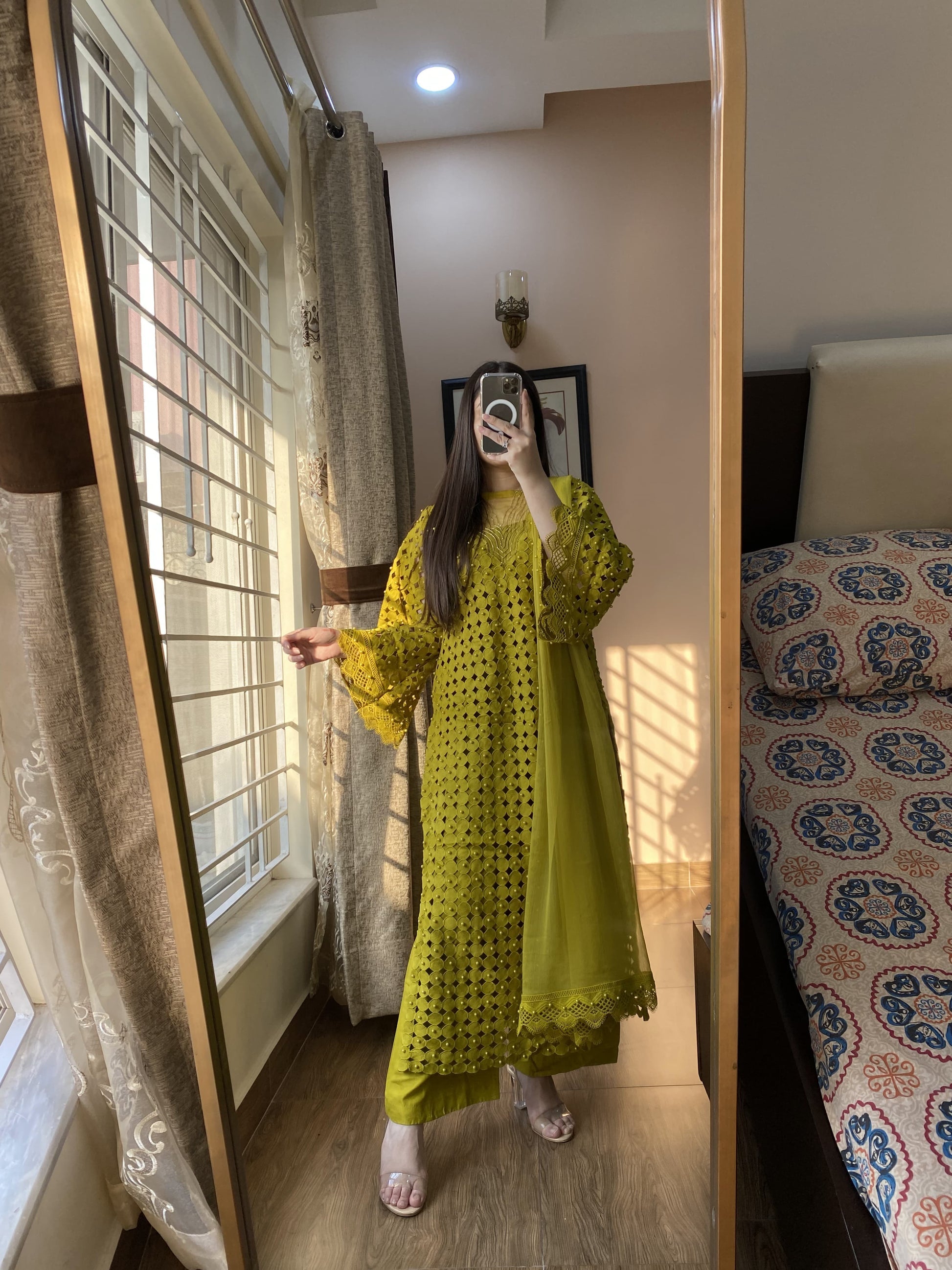 A classic blend of traditional craftsmanship and modern cuts. This ensemble features intricate Adda work and pearl embellishments on a premium Cotton Croatia canvas.