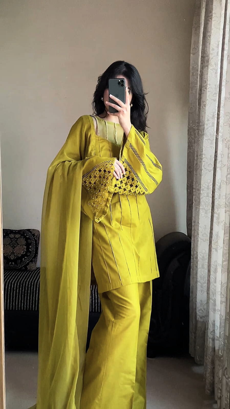 Sleeves: Bell-bottom style with Shuttle-less lace.
