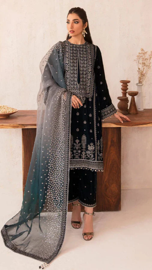 Glide into winter festivities like a gazelle in our classic and elegant 3 piece outfit from the velvet collection. Deep and beautiful maroon-colored, pure velvet shirt is uplifted with refined thread work on the neckline and sleeves. Paired with monochrome velvet pants and a fancy organza dupatta to complete this outfit and make you look effortlessly beautiful. winter.