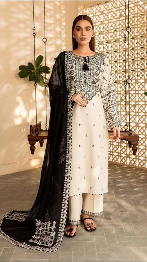 This luxurious three-piece lawn ensemble is designed with exquisite embroidery, offering a perfect blend of elegance and sophistication. The beautifully embroidered neck patch enhances the outfit’s charm, while the intricately embroidered daman patch adds a touch of grace. The chiffon dupatta is a true masterpiece, adorned with delicate embroidery on the sides and elegantly finished with four-sided attached bunches, adding a regal touch. Paired with a comfortable yet stylish trouser, this ensemble is ideal for any festive or semi-formal occasion. A must-have for those who appreciate fine craftsmanship and timeless fashion, ensuring you stand out effortlessly.