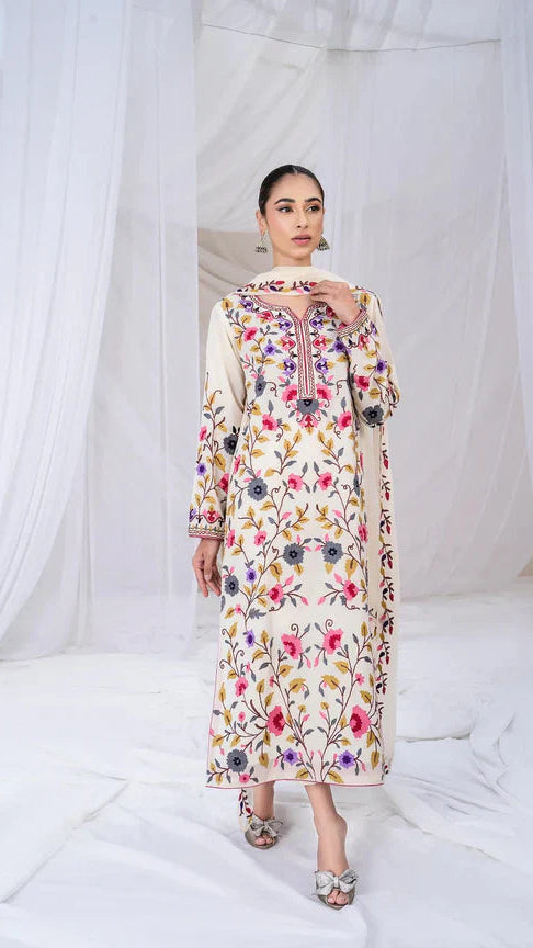 This elegant suit set is perfect for any special occasion, combining intricate craftsmanship with classic style. It features a heavily embroidered front for the shirt and a matching neckline embroidered patch, adding rich detail and sophistication. Both sleeves come with coordinating embroidery, while the back and trousers are made from high-quality plain dyed fabric for a sleek finish. The ensemble includes a beautifully embroidered four-sided dupatta that enhances its traditional charm. Ideal for festive events or formal gatherings, this suit blends luxury and comfort in every stitch. Dupatta and trouser are soft and breathable.